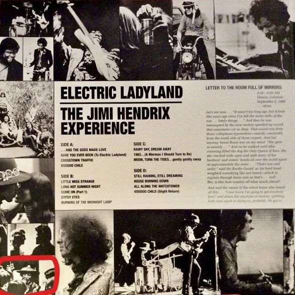It was March, 1968. Thom Lukas was caught trying to sneak into a Jimi Hendrix Experience concert, by the New York City Police, and rescued from them by Jimi Hendrix himself. This was the first time that Thom photographed a rock star. A photo of Jimi talking to Thom, and the other kids caught by the cops that night at Hunter College, appears on the bottom left inside cover of the Electric Ladyland LP. It was taken by Jimi’s friend, photographer David Sygall.